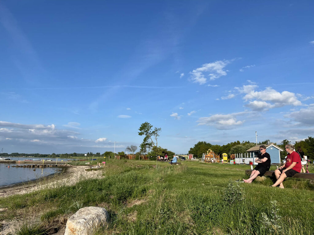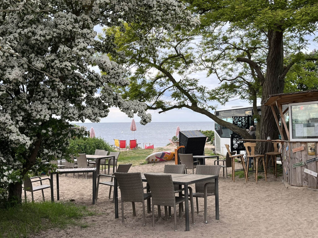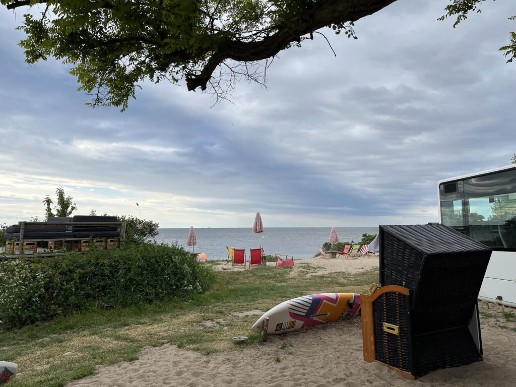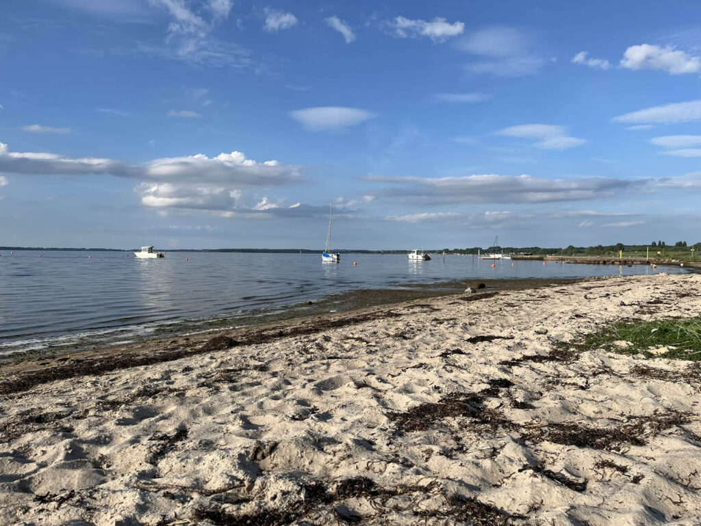 Man gelangt über einen Fuß-/Radweg sehr bequem zum Strand, kann aber auch mit dem Auto hinfahren und dort ganz nahe am Wasser parken. In etwa 800 Meter Entfernung vom Strand kann man zu Fuß oder auch mit dem Auto den Campingplatz auf dem Werder ansteuern, wo man eine supernette Strandbar mit Meerblick besuchen kann.