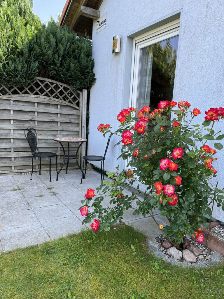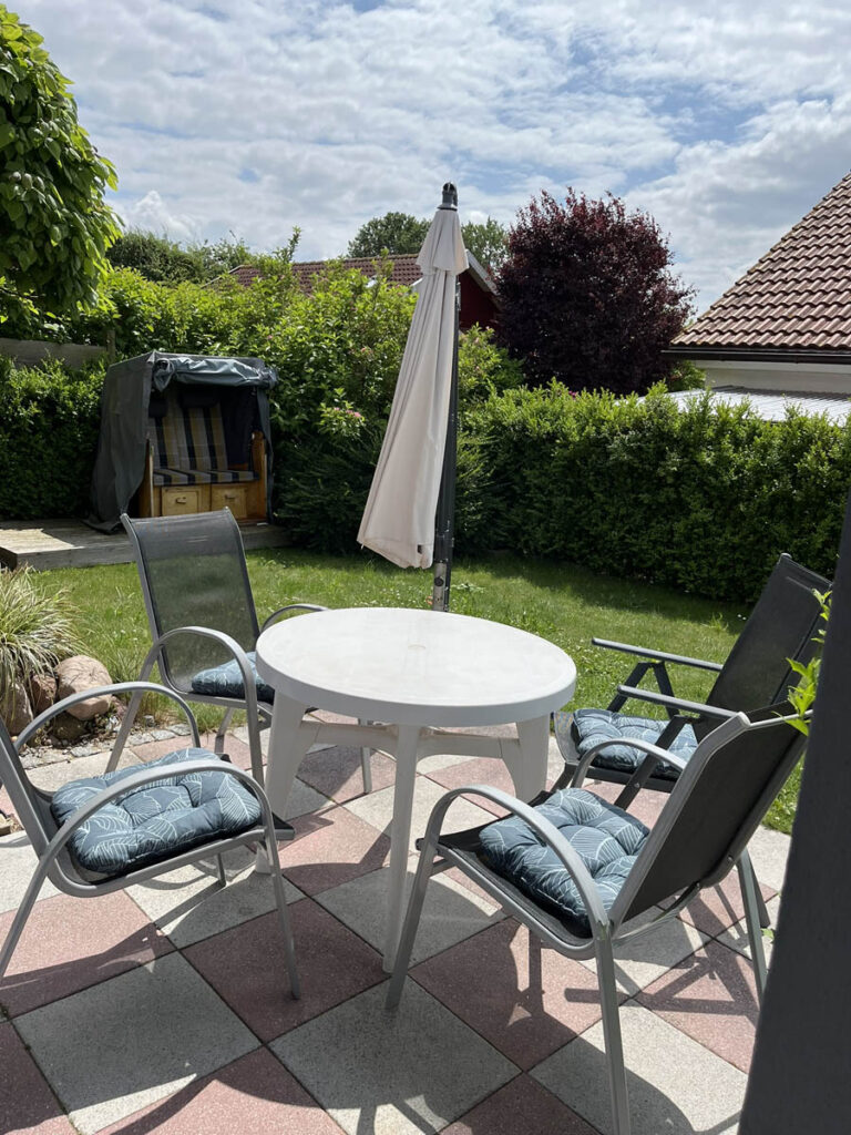 Großer Garten, der ganz durch Zaun und Hecke umschlossen ist: Zwei Terrassen mit Gartenmöbeln und großem Sonnenschirm. Strandkorb, wo man es auch bei Wind gut aushalten kann. Im Garten kann für Kinder ein Planschbecken oder auch ein kleines Spielzelt aufgestellt werden. Von der großen Terrasse und dem Strandkorb aus kann man den Sonnenuntergang genießen.